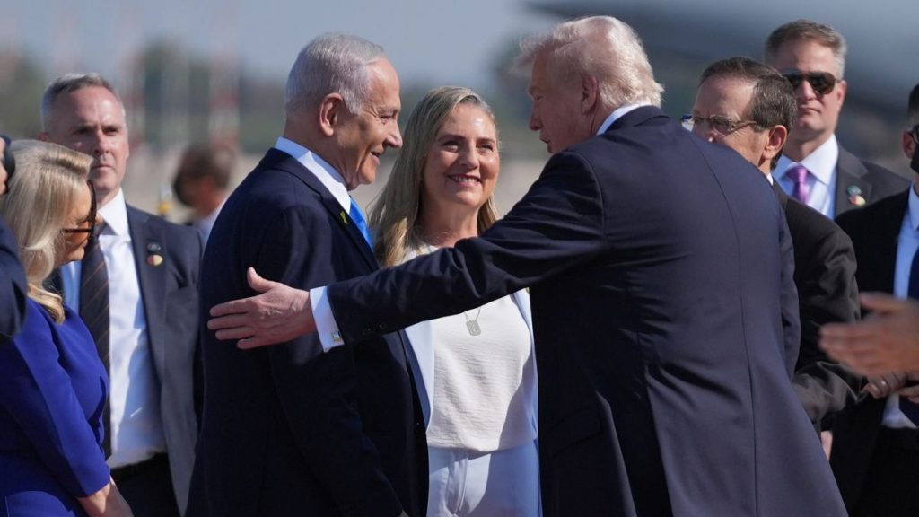 সিঁড়ি বেয়ে নামার পর ট্রাম্প ইসরায়েলের প্রধানমন্ত্রী বেনিয়ামিন নেতানিয়াহুর সঙ্গে হাত মেলান এবং হাসিমুখে শুভেচ্ছা বিনিময় করেন।