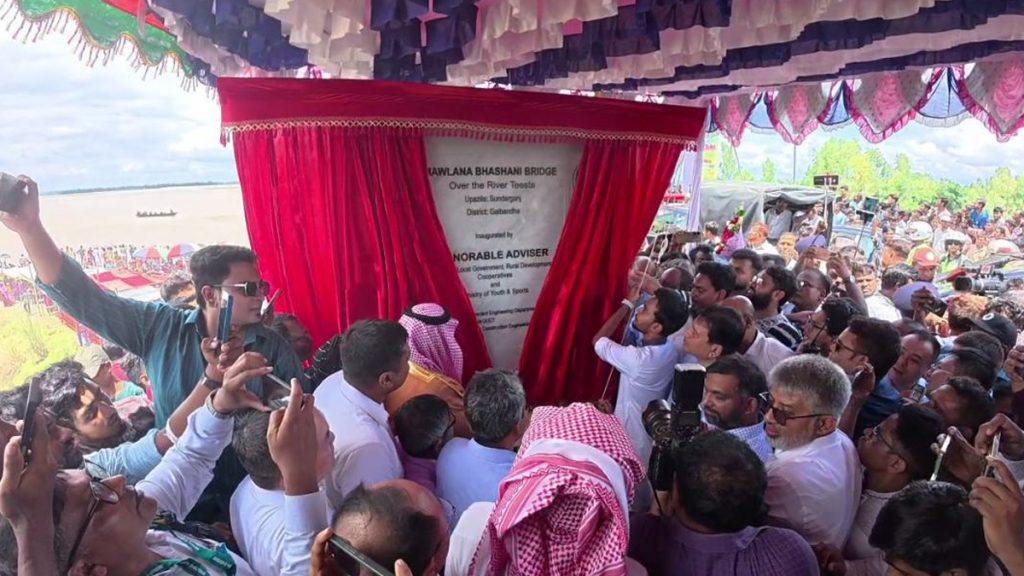 দীর্ঘ প্রতীক্ষার অবসান ঘটিয়ে অবশেষে উদ্বোধন হলো গাইবান্ধা ও কুড়িগ্রামের মানুষের বহু আকাঙ্ক্ষার ‘মওলানা ভাসানী সেতু’। বুধবার (২০ আগস্ট) দুপুর পৌনে ১টার দিকে ফলক উন্মোচনের মাধ্যমে সেতুর আনুষ্ঠানিক উদ্বোধন করেন অন্তর্বর্তীকালীন সরকারের স্থানীয় সরকার, পল্লী উন্নয়ন ও সমবায় মন্ত্রণালয়ের উপদেষ্টা আসিফ মাহমুদ সজীব ভূঁইয়া। উদ্বোধনের আগে তিনি রংপুর থেকে সড়কপথে সুন্দরগঞ্জ উপজেলা হয়ে সেতুস্থলে পৌঁছান এবং ফলক উন্মোচনের পর গাড়ি বহরে সেতুর দুই প্রান্ত পরিদর্শন করেন।