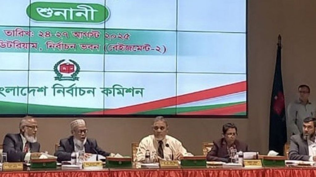 সংসদীয় আসনের সীমানা পুনর্নির্ধারণ নিয়ে দাবি-আপত্তির শুনানি শুরু করেছে নির্বাচন কমিশন (ইসি)। রোববার (২৪ আগস্ট) বেলা ১২টায় রাজধানীর আগারগাঁও নির্বাচন ভবনে এই শুনানি শুরু হয়। প্রধান নির্বাচন কমিশনার কাজী হাবিবুল আউয়াল, চার নির্বাচন কমিশনার ও ইসি সচিব এতে উপস্থিত ছিলেন। প্রথম দিনের শুনানিতে কুমিল্লা অঞ্চলের ১৮টি আসন নিয়ে আলোচনা হয়। এ সময় ব্রাহ্মণবাড়িয়া-২, ৩ ও ৫ আসন থেকে শুরু করে নোয়াখালী, চাঁদপুর, ফেনী ও লক্ষ্মীপুরের বেশ কিছু আসনের শুনানি অনুষ্ঠিত হয়। তবে শুনানির একপর্যায়ে এনসিপির যুগ্ম মুখ্য সংগঠক আতাউল্লাহ এবং রুমিন ফারহানা গ্রুপের মধ্যে হট্টগোলের ঘটনা ঘটে।