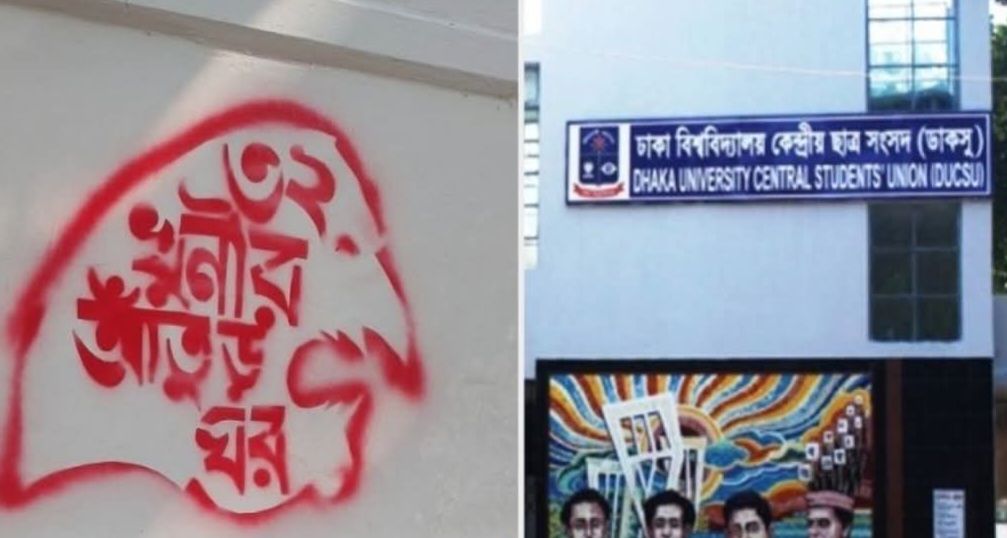 ঢাকা বিশ্ববিদ্যালয় কেন্দ্রীয় ছাত্র সংসদের (ডাকসু) দেয়ালে দেখা মিলেছে অদ্ভুত ও বিতর্কিত লেখার। সরেজমিনে গিয়ে দেখা যায়, দেয়ালে বড় অক্ষরে লেখা রয়েছে “৩২ খুনির আঁতুড়ঘর”। সংবেদনশীল এ গ্রাফিতিকে কেন্দ্র করে শিক্ষার্থীদের মধ্যে তৈরি হয়েছে তীব্র মতবিরোধ।