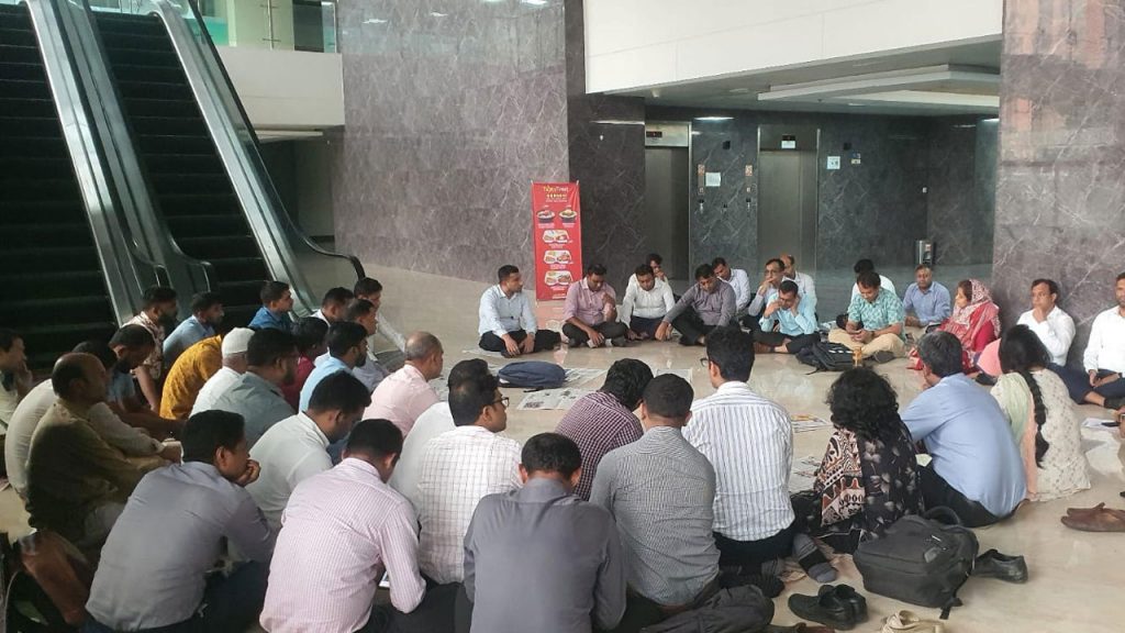 কনফারেন্স রুম না পেয়ে এনবিআর ভবনের মেঝেতে বসে সভা করলেন শতাধিক কর্মকর্তা-কর্মচারী