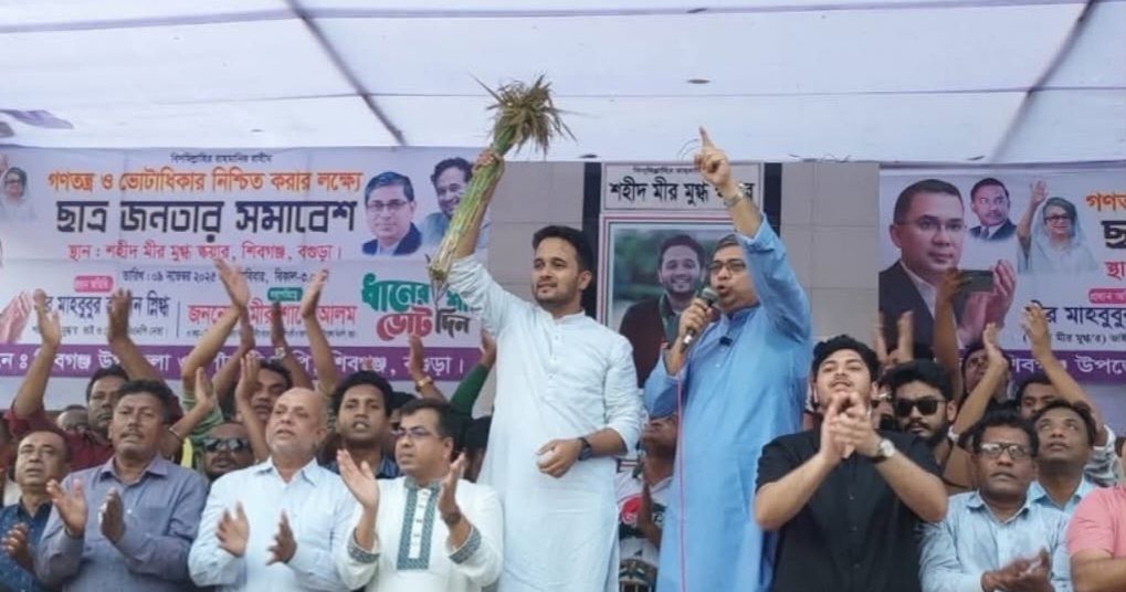 বগুড়া-২ (শিবগঞ্জ) আসনে উচ্ছ্বাস ও আবেগঘন পরিবেশের মধ্য দিয়ে স্বাগত জানানো হলো জুলাই যোদ্ধা ও শহীদ মীর মুগ্ধের জমজ ভাই মীর মাহবুবুর রহমান স্নিগ্ধকে। রবিবার (০৯ নভেম্বর) বিকেল ৪টায় বগুড়া জেলার শিবগঞ্জ উপজেলার মীর মুগ্ধ স্কয়ারে উপজেলা ও পৌর বিএনপির উদ্যোগে আয়োজিত ছাত্র–জনতার সমাবেশে অংশ নেন তিনি।