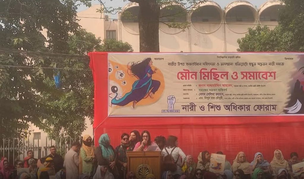 শুক্রবার বিকেলে শাহবাগ মোড়ে জড়ো হওয়া বিভিন্ন বিশ্ববিদ্যালয়ের শিক্ষার্থী, নারী অধিকার কর্মী ও পেশাজীবীরা স্লোগান দেন—